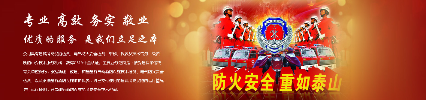 公司具有建筑消防設(shè)施檢測、電氣防火安全檢測、維修、保養(yǎng)及技術(shù)咨詢一級資質(zhì)的中介技術(shù)服務機構(gòu),獲得CMA計量認證。主要業(yè)務范圍是:接受建設(shè)單位或有關(guān)單位委托,承擔新建、改建、擴建建筑自動消防設(shè)施技術(shù)檢測、電氣防火安全檢測、以及承接建筑消防設(shè)施維護保養(yǎng),對已交付使用的建設(shè)消防設(shè)施的運行情況進行運行檢測,開展建筑消防設(shè)施的消防安全技術(shù)咨詢。公司設(shè)辦公室、總工辦、財務部、檢測部、維保部等職能機構(gòu),擁有一