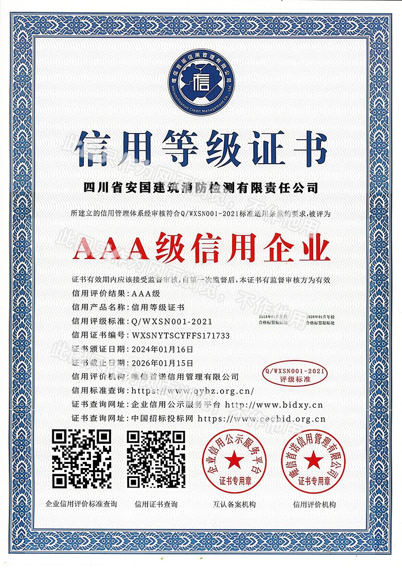 四川省安國建筑消防檢測有限責任公司,成立于1998年,經(jīng)四川省公安消防總隊批準,工商部門注冊的獨立法人單位。